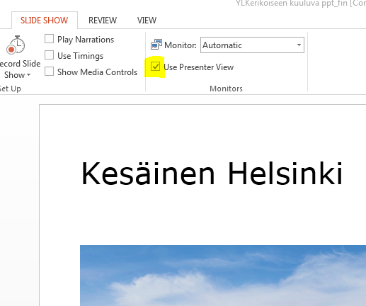 Tekninen vinkki: Kalvosarjan alussa on video Turun yleiskokouksesta 2014. Mikäli video ei näy heti, käy ottamassa pois rasti ruudusta "presenter view". Kuva tästä löytyy alta "ohje videon näyttämiseen".