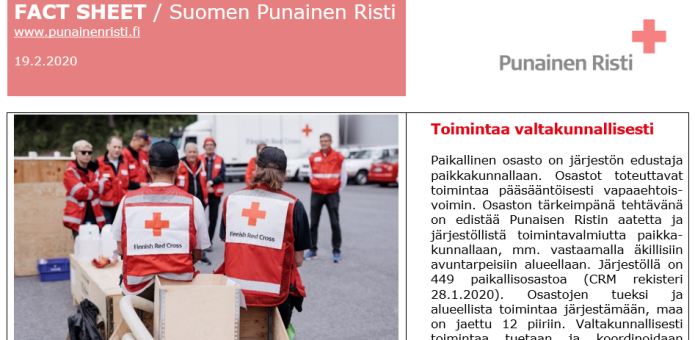 Etsitkö lyhyttä ja tiivistä yhteenvetoa Suomen Punaisesta Rististä? Sellainen löytyy nyt alla liitteenä. Kyseessä kahden sivun ns. Fact Sheet, johon on koottu yleistä tietoa, tärkeitä linkkejä sekä yleisimpiä tilastolukuja toiminnasta.