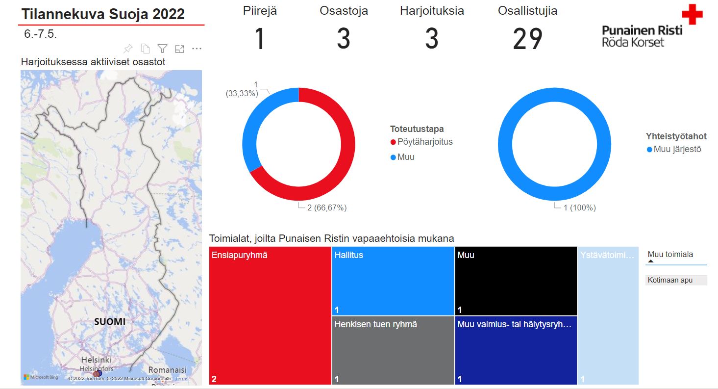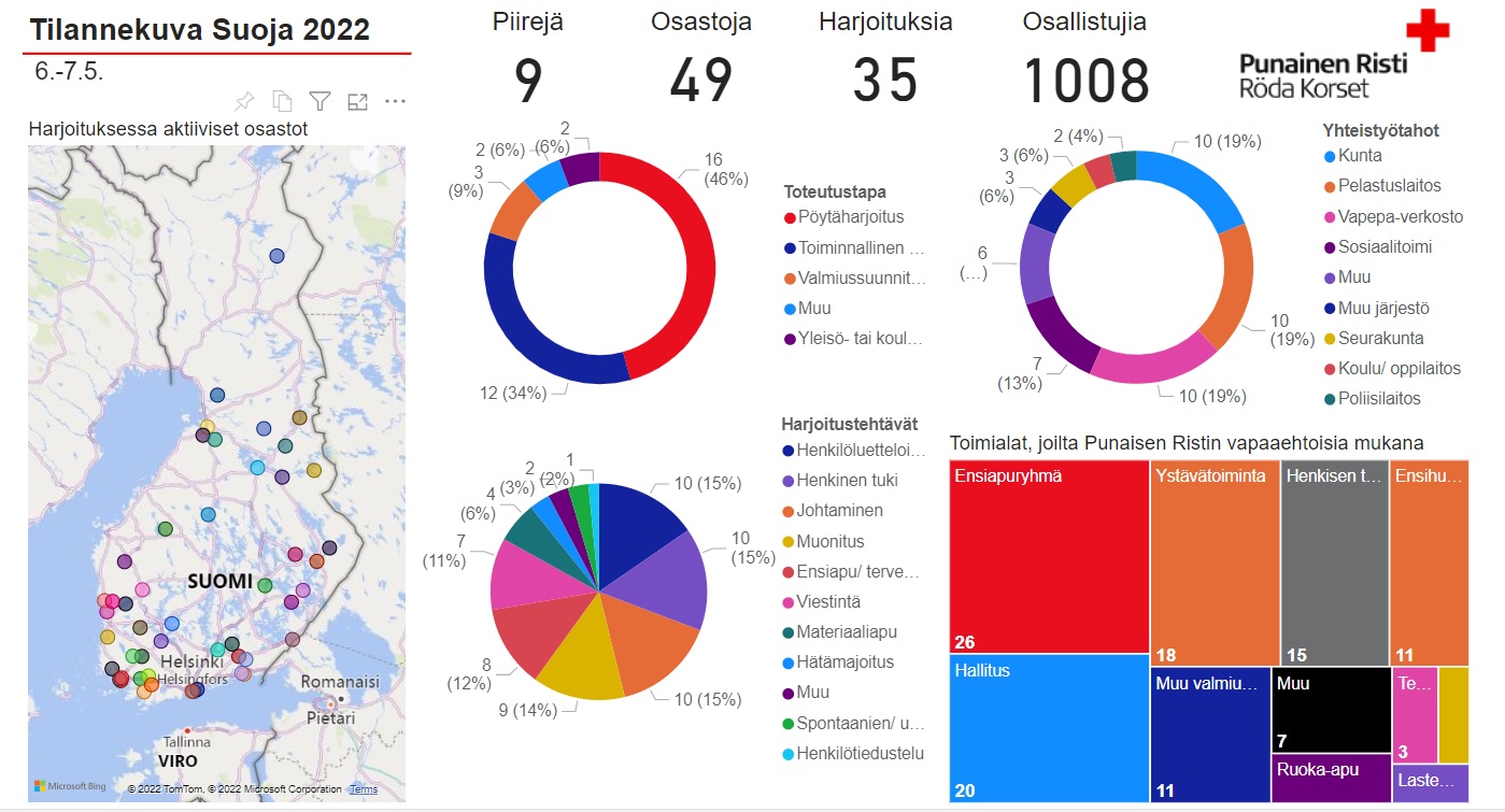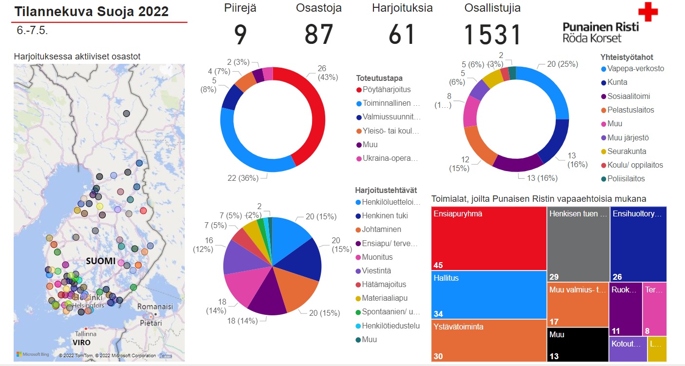 Suoja 2022 harjoitus on päättynyt. Suuri kiitos teille kaikille vapaaehtoisille, jotka olitte mukana sitä järjestämässä! Ilman teitä harjoitusta tai yleensä Punaisen Ristin auttamisvalmius ei toimisi. Kiireisestä keväästä huolimatta harjoituksia on nyt jo raportoitu 62 ja niihin on osallistunut 87 osastoa ja 1547 osallistujaa. Kaikki harjoitukset eivät ole vielä raportissa mukana, joten määrä on todellisuudessa suurempi. Minusta se on oikein hyvä osallistujamäärä! Palaute (lyhyesti raportissa) on ollut hyvää: harjoitusmallit olivat toimivia, harjoittelu on sujunut hyvällä fiiliksellä ja mukaan on tarttunut uutta oppia ja oivalluksia -ja sehän tässä oli tarkoitus. Varsinainen loppuraportti arviointeineen tehdään myöhemmin.