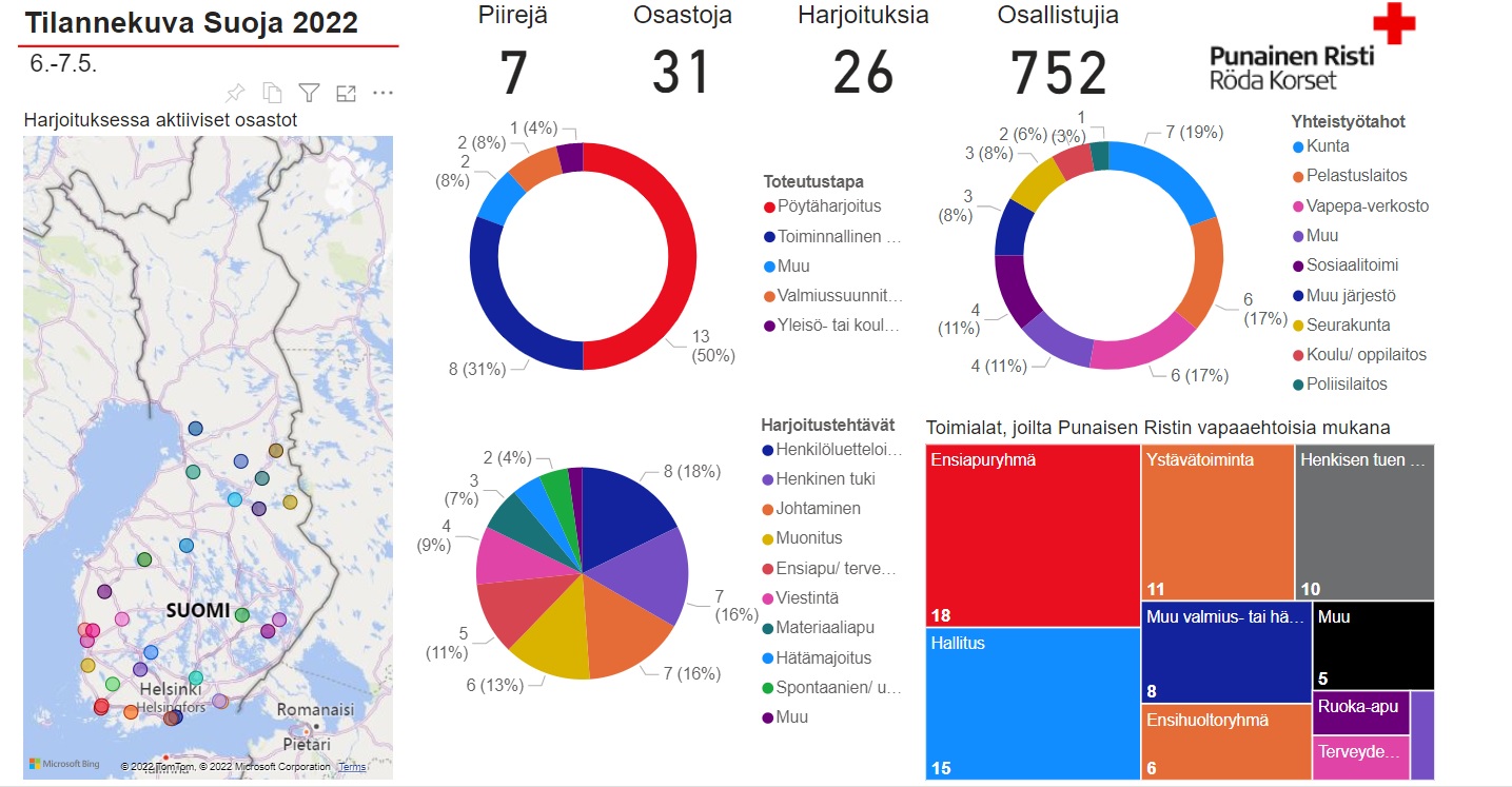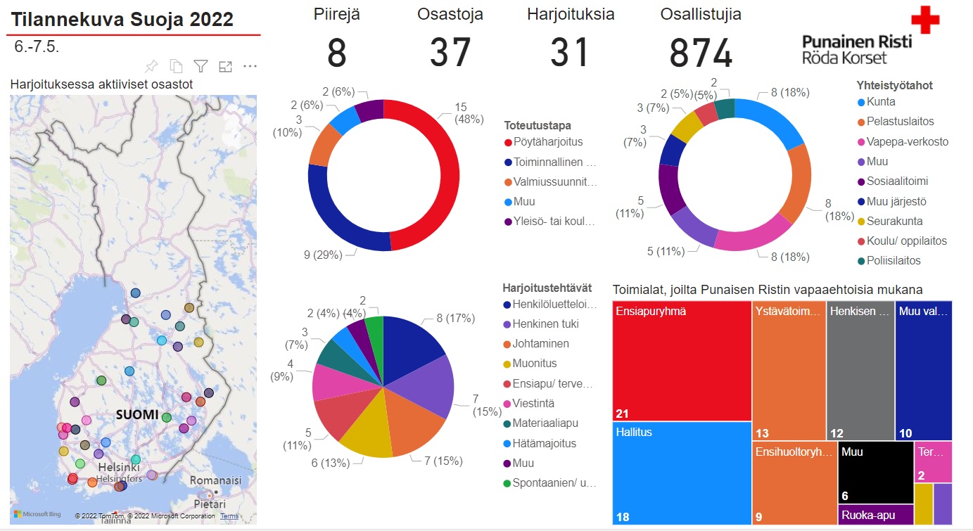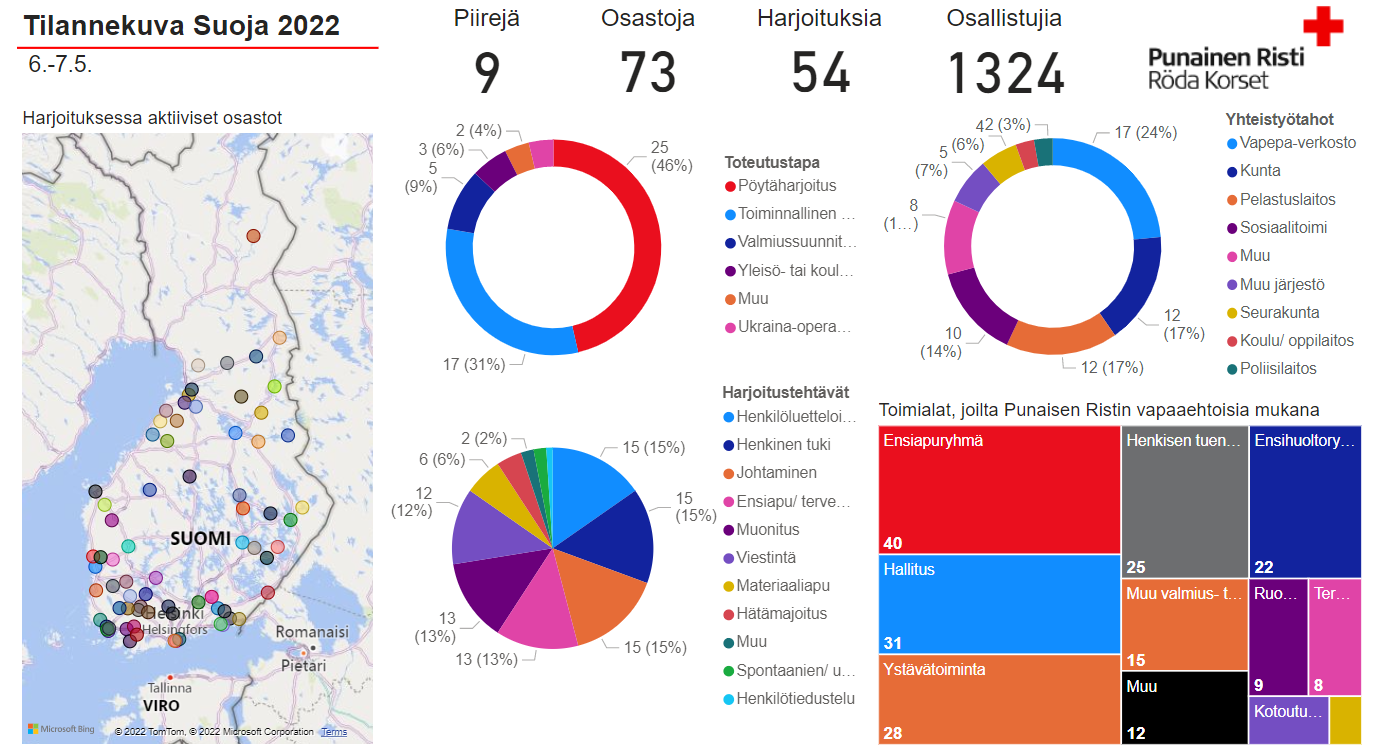 Suoja 2022 harjoitus on päättynyt. Suuri kiitos teille kaikille vapaaehtoisille, jotka olitte mukana sitä järjestämässä! Ilman teitä harjoitusta tai yleensä Punaisen Ristin auttamisvalmius ei toimisi. Kiireisestä keväästä huolimatta harjoituksia on nyt jo raportoitu 62 ja niihin on osallistunut 87 osastoa ja 1547 osallistujaa. Kaikki harjoitukset eivät ole vielä raportissa mukana, joten määrä on todellisuudessa suurempi. Minusta se on oikein hyvä osallistujamäärä! Palaute (lyhyesti raportissa) on ollut hyvää: harjoitusmallit olivat toimivia, harjoittelu on sujunut hyvällä fiiliksellä ja mukaan on tarttunut uutta oppia ja oivalluksia -ja sehän tässä oli tarkoitus. Varsinainen loppuraportti arviointeineen tehdään myöhemmin.