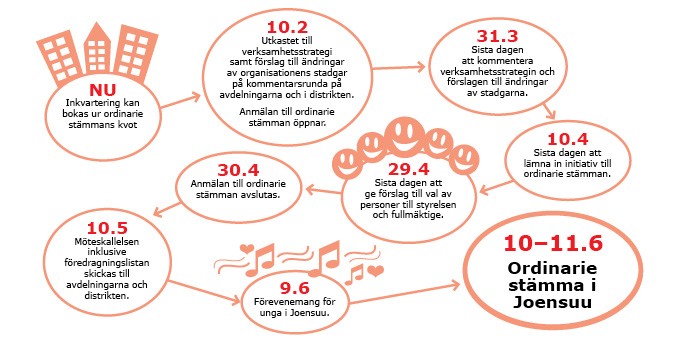 Vid Finlands Röda Kors ordinarie stämma i Joensuu den 10–11 juni fattas beslut om vilka frågor vi tillsammans ska satsa på under de tre kommande åren. Spara de viktiga datumen och anmäl dig!