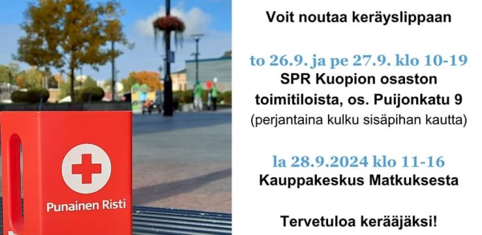 To 26.9 ja pe 27.9. klo 10-19 SPR Kuopion toimitiloista (Puijonkatu 9). Perjantaina keräyskeskukseen käynti sisäpihan (porttikongi) kautta.