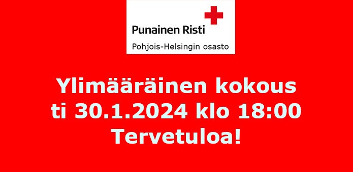 Lämpimästi tervetuloa Suomen Punaisen Ristin Pohjois- ja Keski-Helsingin osaston ylimääräiseen kokoukseen tiistaina 30.1.2024 klo 18.00! Kokouspaikkana on osaston toimitila osoitteessa Kaustisenpolku 5 LH2, 00420 Helsinki.