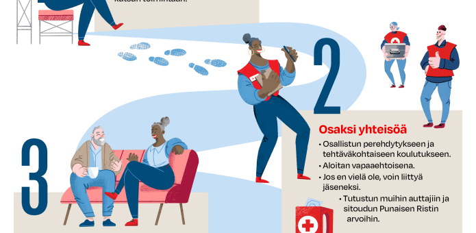 - Vapaaehtoistoimintaan: Järjestämme monipuolisia vapaaehtoistoiminnan muotoja, kuten ystävätoimintaa, keräyksiä ja ensiapuryhmän toimintaa.