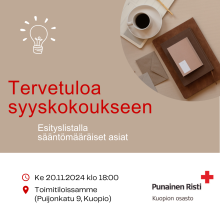 Tervetuloa osaston syyskokoukseen keskiviikkona 20.11.2024 klo 18 toimitiloihimme (Puijonkatu 9, Kuopio).