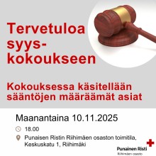 Punaisen Ristin Riihimäen osaston sääntömääräinen syyskokous pidetään maanantaina 10.11.2025 klo 18.00 alkaen osaston toimitilalla osoitteessa Keskuskatu 1. Kokouksessa käsitellään sääntöjen määräämät asiat.